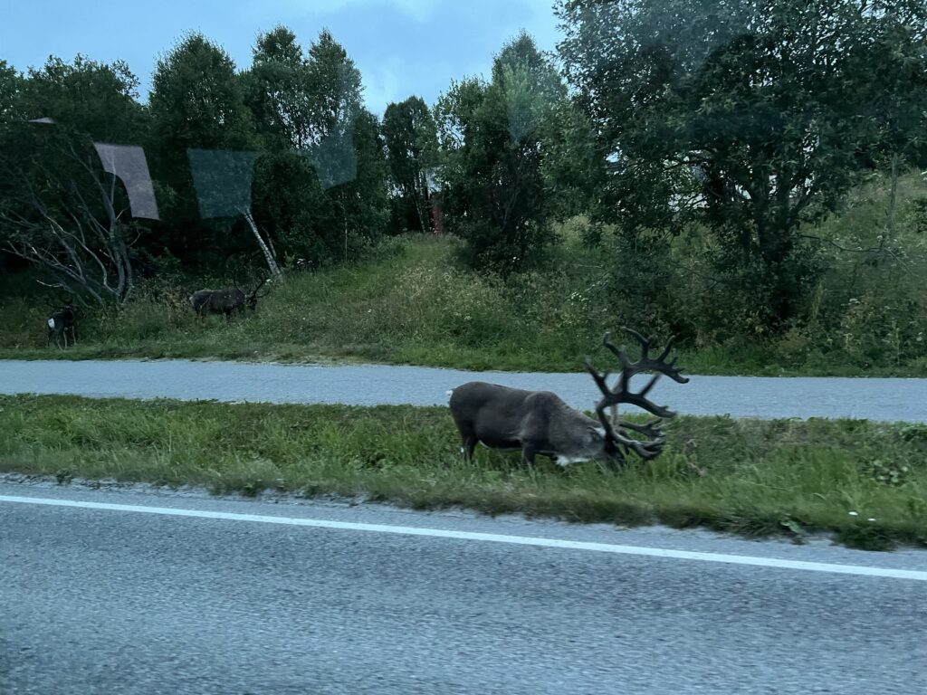 Auf dem Rückweg haben wir am Straßenrand ein paar wilde Rentiere gesehen.