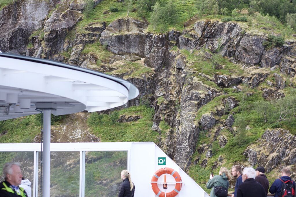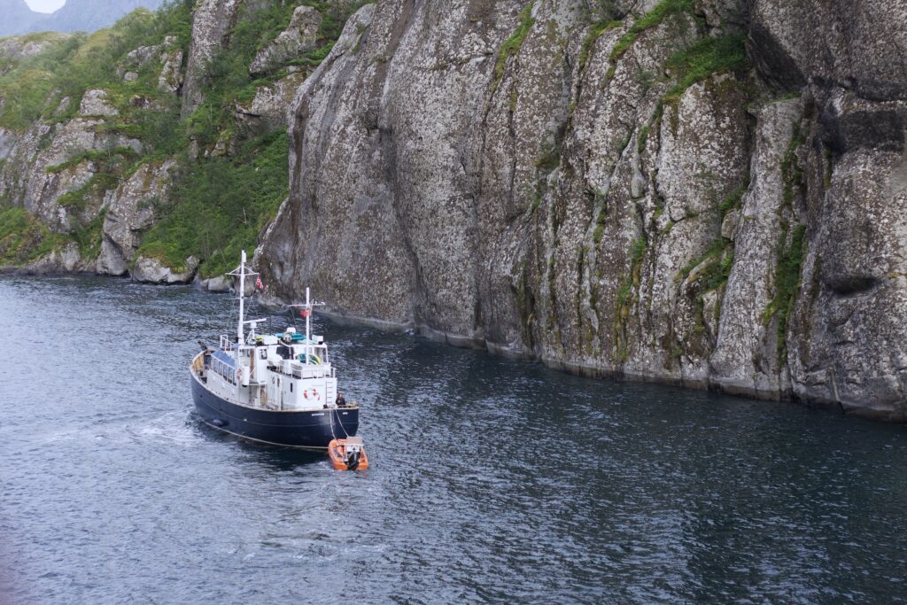Heute haben wir den ganzen Tag auf dem Schiff verbracht. Nach einem sehr üppigen Frühstück und einem Mittagsschlaf gab es auf dem Außendeck ein “Trolldrink”, heiße Schokolade mit Schuss, und eine Waffel mit traditioneller Trollkreme. Trollkreme ist ein norwegischer Nachtisch aus Eiweiß, Beerenmarmelade und etwas Vanillezucker und schmeckt sehr gut. Das ganze wurde in einer hübschen Tasse serviert, die man auch behalten durfte.